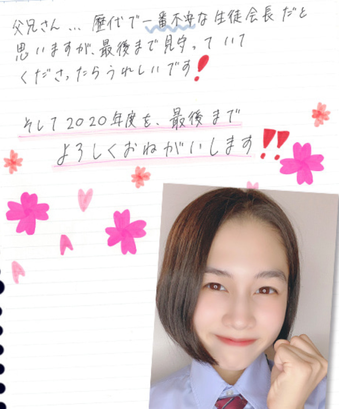 Saya pikir saya masih tidak dapat diandalkan sebagai ketua OSIS, tetapi saya ingin melakukan sesuatu sambil menikmati diri saya dengan sepenuh hati dan tetap jujur pada diri saya sendiri, jadi mari kita berdiri berdampingan, kita semua, dan tersenyum sebaik mungkin sampai akhir, oke?
